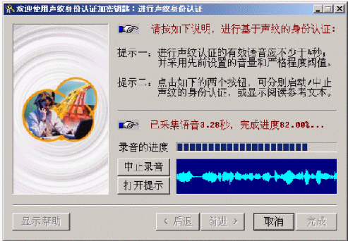 在彈出的窗口中輸入用戶名并點(diǎn)擊"語(yǔ)音身份認(rèn)證"按鈕,從彈出窗口中點(diǎn)擊"聲紋認(rèn)證"按鈕,根據(jù)系統(tǒng)提示,對(duì)著麥克風(fēng)說(shuō)出含有4秒以上有效語(yǔ)音的任意一段話,讓系統(tǒng)進(jìn)行聲紋身份認(rèn)證。如果被拒絕,系統(tǒng)會(huì)顯示一個(gè)對(duì)話框,提示用戶選擇是繼續(xù)嘗試,還是放棄;如果通過(guò),則系統(tǒng)會(huì)自動(dòng)打開(kāi)用戶的私有加密文件目錄。