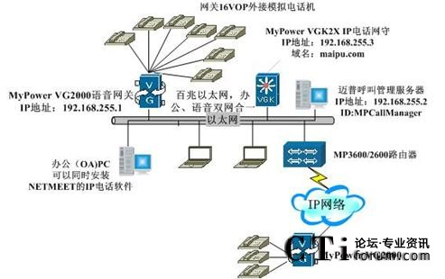 在這種應用中,用戶通過IP網絡接入以太網IP電話機的同時,還可以在MyPower VG2000 IP語音網關上插入兩張16VOP IP電話模塊,接32個普通電話機。這32個電話機就像其它以太網IP電話機一樣可以和其它IP網上的IP電話機互相呼叫,此時,我們把MyPower VG2000 IP語音網關作為一個小型的PBX接入平臺。