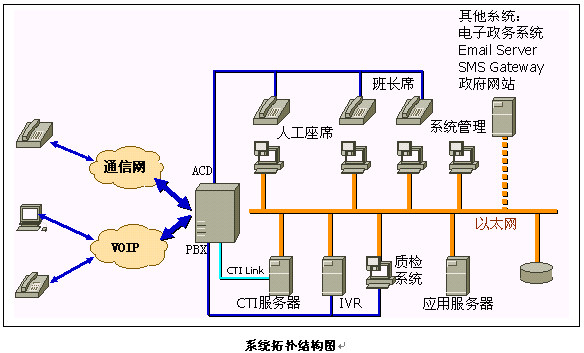 采用瀏覽器<->應用服務器<->數(shù)據(jù)庫多層系統(tǒng)結構;座席和IVR均采用該結構,充分利用最新技術,系統(tǒng)性能和可維護性高。