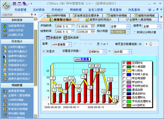 綜合呼叫量統(tǒng)計(jì):可以根據(jù)“月份”、“天”、“小時(shí)”、“半小時(shí)”、“周”來統(tǒng)計(jì)綜合呼叫量。統(tǒng)計(jì)的指標(biāo)包括:呼入電話總數(shù)、進(jìn)入ACD電話總數(shù)、ACD應(yīng)答電話數(shù)、ACD通話時(shí)長(zhǎng)、ACD放棄電話數(shù)、軟電話呼出電話數(shù)、軟電話呼出時(shí)長(zhǎng)、排隊(duì)接通率。