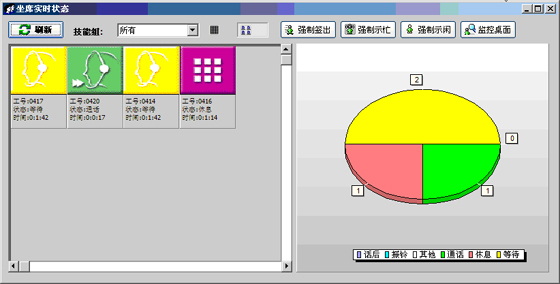 當(dāng)前座席狀態(tài):能夠提供座席的狀態(tài)表示,狀態(tài)持續(xù)時(shí)間,對(duì)應(yīng)的技能組,對(duì)應(yīng)的分機(jī)號(hào)碼,對(duì)應(yīng)的IP地址等信息。可以對(duì)任何一個(gè)座席進(jìn)行強(qiáng)制簽出、強(qiáng)制示忙、強(qiáng)制示閑操作?梢詫(duì)任意座席進(jìn)行屏幕監(jiān)控操作(無需任何第三方軟件)。