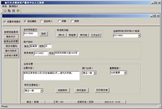 旅行社客戶服務(wù)中心系統(tǒng)將接入功能、導(dǎo)航功能、自動(dòng)語音查詢功能、人工座席服務(wù)功能、話路轉(zhuǎn)接功能、信息資料處理緊密聯(lián)系起來。用戶撥打特服電話號(hào)碼后,可以根據(jù)需要選擇人工服務(wù)、自動(dòng)語音查詢、自動(dòng)留言,并能夠在幾種服務(wù)中來回切換或轉(zhuǎn)接其它電話;所記錄的資料可以分門別類的進(jìn)行統(tǒng)計(jì)并形成報(bào)表,供相關(guān)部門進(jìn)行檢索查閱;意見處理完畢,可由座席主動(dòng)呼叫用戶,告知處理意見,形成閉環(huán)處理流程;從而打造全新的客戶服務(wù)形象。