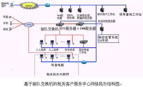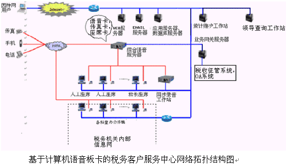 對于20個以下人工座席的中小型稅務(wù)客戶服務(wù)中心系統(tǒng),則建議使用基于計算機(jī)語音板卡的方式,可以減少投資,同時具有良好的系統(tǒng)性能;對于大型的稅務(wù)客戶服務(wù)中心系統(tǒng),可選用排隊(duì)交換機(jī)作為語音接入設(shè)備,以保障系統(tǒng)的高可靠性和穩(wěn)定性;大大提高了系統(tǒng)的適應(yīng)面。
