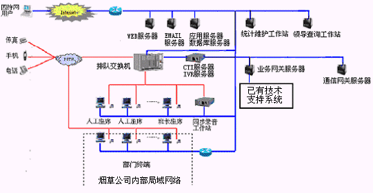 該煙草公司呼叫中心主要是由帶語(yǔ)音板卡的工控機(jī)或排隊(duì)交換機(jī)、CTI服務(wù)器、IVR(交互式語(yǔ)音應(yīng)答)/IFR(交互式傳真應(yīng)答)子系統(tǒng)、人工座席子系統(tǒng)、應(yīng)用服務(wù)器、數(shù)據(jù)庫(kù)服務(wù)器、業(yè)務(wù)網(wǎng)關(guān)子系統(tǒng)、通信網(wǎng)關(guān)子系統(tǒng)等硬件設(shè)備和應(yīng)用軟件組成。