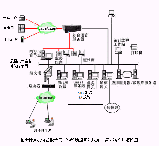 本系統(tǒng)提供基于計算機語音板卡和排隊交換機兩種語音接入方式,都支持1號和7號信令線路的接入。對于大中型的12365質(zhì)監(jiān)熱線服務系統(tǒng),可選用排隊交換機作為語音接入設備,保障系統(tǒng)的高可靠性和穩(wěn)定性;對于20個以下座席的中小型12365質(zhì)監(jiān)熱線服務系統(tǒng),則建議使用基于計算機語音板卡的形式,可以減少企業(yè)投資,同時具有良好的系統(tǒng)性能。