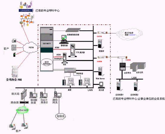 實(shí)現(xiàn)共享已有呼叫中心業(yè)務(wù)系統(tǒng)的資源:通過(guò)城域網(wǎng)或因特網(wǎng)實(shí)現(xiàn)與現(xiàn)有呼叫中心相關(guān)業(yè)務(wù)系統(tǒng)的連接與集成,諸如業(yè)務(wù)數(shù)據(jù)的提取等。一期工程留有相應(yīng)的接口。