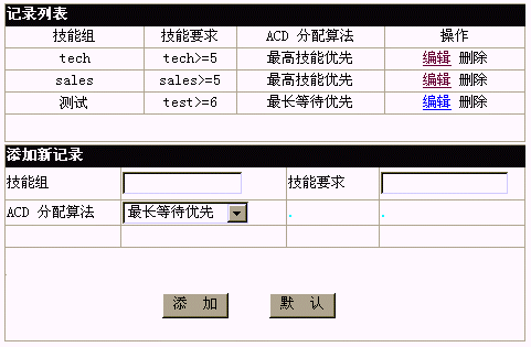 設置技能組:定義一個技能組名稱,給出一項技能的值范圍表達式,凡具備該技能且技能值屬于該范圍的座席,將自動加入該技能組。