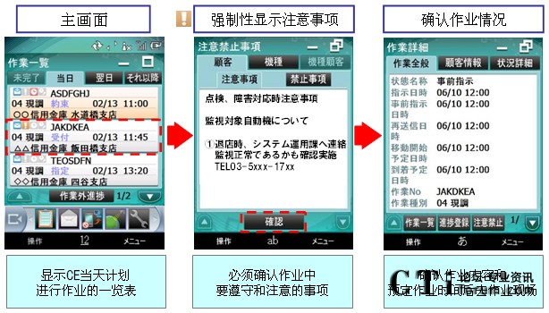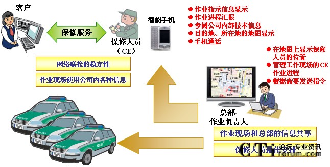 “MoBiz AP for CE支持系統(tǒng)”是在支持保修人員在工作現(xiàn)場作業(yè)的同時,實(shí)現(xiàn)總部對工作現(xiàn)場“可視化”管理的應(yīng)用程序軟件包。