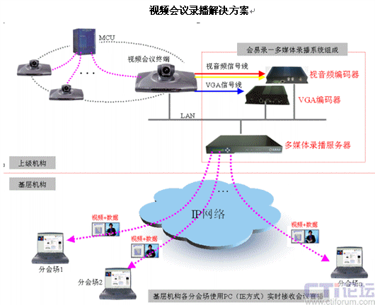 如圖所示,上級機構視音頻編碼器接在視音頻源上,對視音頻信號采集,VGA編碼器采集VGA信號,通過網絡傳給放在機房的多媒體錄播服務器;鶎訖C構的各個分會場通過IE瀏覽器的方式接受會議直播。