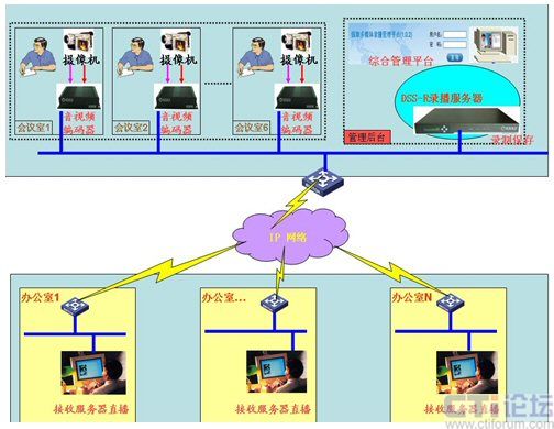 基于上述的需求,經(jīng)過調(diào)研選用深圳銳取錄播服務(wù)器產(chǎn)品完成上述的功能需求。如圖所示,通過放置在每個(gè)會議室考場內(nèi)的攝像機(jī),將竟聘者的圖像與聲音傳輸?shù)较噙B接的銳取公司的視音頻編碼器上,通過編碼器的編碼將采集的信號(通過內(nèi)部網(wǎng)絡(luò))傳輸?shù)胶笈_的管理平臺上的DSS-R錄播服務(wù)器中。服務(wù)器的直播模塊將從音視頻編碼器接收到的信號分發(fā)到網(wǎng)絡(luò)中,每個(gè)接入內(nèi)網(wǎng)絡(luò)的辦公室內(nèi)里的電腦通過專有客戶端接收考場實(shí)時(shí)內(nèi)容,實(shí)現(xiàn)了真正意義上的接受機(jī)關(guān)廣大干部群眾的監(jiān)督考察。同時(shí)錄播服務(wù)器內(nèi)置的錄制模塊,將收到的信號內(nèi)容解碼錄制保存(服務(wù)器內(nèi)有可供存儲的硬盤),為日后干部的選擇做到了有理可依,有據(jù)可查。