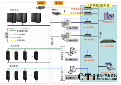 如上圖所示,該機(jī)房分為設(shè)備間和操作間,小型機(jī)等主機(jī)系統(tǒng)安裝在設(shè)備間內(nèi),平時(shí)工作人員通常在操作間內(nèi)通過Telnet終端及KVM控制臺(tái)等方式訪問主機(jī)系統(tǒng)進(jìn)行操作,這些Telnet終端、KVM控制臺(tái)即為機(jī)房?jī)?nèi)人與機(jī)器打交道的“人機(jī)界面”。