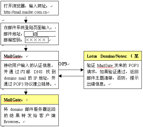 金笛郵件網(wǎng)關(guān)完全基于B/S架構(gòu)的設(shè)計(jì),使得郵件收發(fā)、管理都是基于瀏覽器完成,客戶端只要打開IE瀏覽器即可,無(wú)需做任何設(shè)置,大大方便了用戶。也就是說(shuō),在城域網(wǎng)任一節(jié)點(diǎn),都可以通過(guò)內(nèi)部域名(DNS)訪問(wèn)郵件網(wǎng)關(guān),然后通過(guò)郵件網(wǎng)關(guān)與用戶所在的domino郵件服務(wù)器通訊,將郵件主題、郵件內(nèi)容顯示在web頁(yè)面上。金笛?郵件網(wǎng)關(guān)的具體工作流程如下: