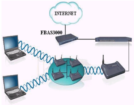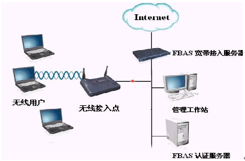 移動用戶通過自身的無線網(wǎng)卡傳遞信息到熱點接收器上,熱點接收器連接到交換機(是為了能具有更好的可拓展性),交換機連接到華夏科技FutureWorks寬帶計費系統(tǒng)的FBAS接入服務(wù)器上,通過接入服務(wù)器連接到INTERNET.這里的FBAS3000系列的寬帶接入服務(wù)器采用的是一體機的模式,接入,認(rèn)證,計費等一系列服務(wù)均安裝在FBAS里,這樣可以簡化網(wǎng)絡(luò)結(jié)構(gòu)。對FBAS的操作是通過WEB頁面來進(jìn)行設(shè)置維護(hù)的,