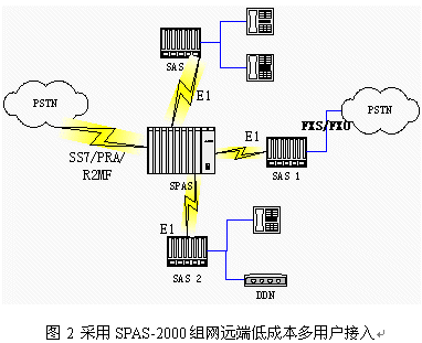 SPAS可編程交換機(jī)通過E1可以支持多個遠(yuǎn)端模塊。遠(yuǎn)端模塊采用SPAS-SAS框,可以帶多種用戶接口:普通模擬用戶、DDN、環(huán)路中繼用戶;通過 SPAS主模塊對外提供各種信令接入。適合多點(diǎn)接入組網(wǎng),且組網(wǎng)成本低。組網(wǎng)圖見圖2: