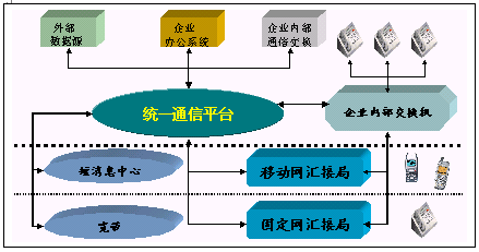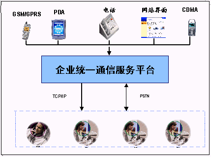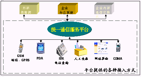 企業(yè)統(tǒng)一通信平臺提供了多種接入方式:人工坐席接入、自動語音IVR、GPRS、WAP接入、寬帶接入、短信息接入;同時(shí)還提供了多種信息發(fā)布方式: