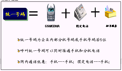 鐵路內(nèi)部員工可以統(tǒng)一所有的通信工具,只使用一個(gè)號碼,一次呼叫便可以完成通信,使通信更加簡單、可靠?梢詫(shí)現(xiàn)換機(jī)換網(wǎng)不換號,用戶獲得一個(gè)終身的聯(lián)系號碼,用戶無論更換任何通信工具,聯(lián)系號碼和方式不會改變。例如:在路局領(lǐng)導(dǎo)找下屬的時(shí)候,只需要撥打他的統(tǒng)一號碼,便可以直接找到他。不必考慮他是否在外出還是在辦公室,是否更換了手機(jī)號碼。統(tǒng)一號碼就像他員工號碼,始終不變,即撥即通!