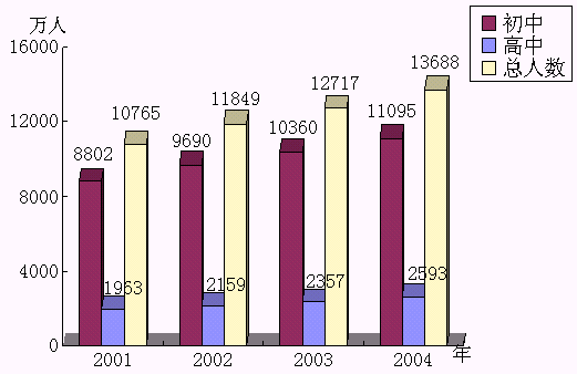據(jù)國(guó)家最新統(tǒng)計(jì)資料分析,2001年中學(xué)學(xué)生人數(shù)已達(dá)10765萬(wàn)人,而且學(xué)生人數(shù)還在快速增長(zhǎng)。初中學(xué)生人數(shù)以每年6.5%的速度增長(zhǎng),普通高中學(xué)生人數(shù)也以每年10%-11%的速度增長(zhǎng)。