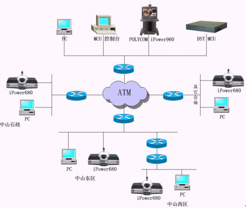 中山公安項(xiàng)目使用一臺(tái)DST H.323 MCS 3048/DFG的MCU、25套IPOWER600 SBRI終端和一套IPOWER900終端,目前終端使用4.01.408版本,通過的是IP OVER ATM網(wǎng)絡(luò),到每個(gè)會(huì)場(chǎng)的帶寬足夠---至少10M,會(huì)議召開速率為768Kbps。市局會(huì)議中心采用IPOWER900,其它25個(gè)分局會(huì)場(chǎng)都使用IPOWER600。