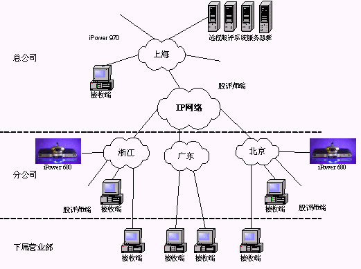 某證券公司有三級網(wǎng)絡(luò),總公司、分公司和下屬營業(yè)部?偣镜椒止編捠2M,在總公司配置一套會議室型電視會議終端POLYCOM 970和一套多點會議服務(wù)器Radvision ViaIP400。在分公司配置了38套會議室型電視會議終端POLYCOM 680,用于與總公司進行雙向視頻會議。分公司到營業(yè)部帶寬是512K,各營業(yè)部安裝遠程股評系統(tǒng)接收端程序,遠程股評系統(tǒng)服務(wù)器都放置在海通總公司。當(dāng)在總公司進行股評時,總公司本地攝像頭拍攝教師畫面,MIC采集教師聲音,傳給服務(wù)器編碼,再通過網(wǎng)絡(luò)供各個接收端接收;當(dāng)在分公司進行股評時,首先分公司的電視會議設(shè)備采集教師畫面及聲音傳回總公司的電視會議設(shè)備,再傳給遠程股評系統(tǒng)的服務(wù)器進行編碼,然后通過網(wǎng)絡(luò)發(fā)布,供接收端接收。(結(jié)構(gòu)如下圖)