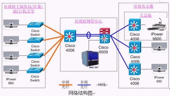 9800,分會場使用iPower 680。網(wǎng)管中心安放一臺Polycom 公司的MGC-50(多點會議控制單元),用于對全網(wǎng)終端的控制,實現(xiàn)多點間、點對點會議。各視頻設(shè)備通過網(wǎng)線連接在各主要交換機上。