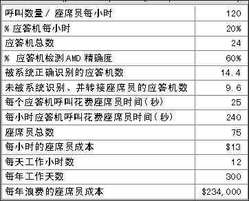 表1和表2表明在一個呼叫中心中精確的應(yīng)答機檢測(AMD)給企業(yè)所帶來的價值,兩表之間關(guān)于呼叫中心運營的費用每年相差$175,500。那么不同的AMD精確度意味著什么?在上例中,精確度每增加1%意味著每年會減少約$5,850的損失。