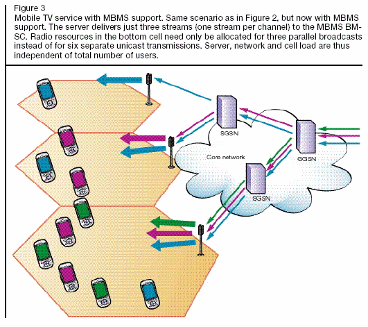 圖3描述了通過MBMS來提供移動(dòng)電視服務(wù)的相同情形。服務(wù)器對(duì)每個(gè)信道只需要傳送一條流媒體連接到MBMS BM-SC。在有需要的時(shí)候,在核心和無線網(wǎng)絡(luò)的數(shù)據(jù)流只有在需要的時(shí)候才被復(fù)制。在這個(gè)例子中,流媒體服務(wù)器只需要處理三個(gè)并發(fā)流媒體鏈接,因此,在最末端的無線節(jié)點(diǎn)使用三個(gè)并發(fā)傳輸會(huì)話就取代了原來的六個(gè)獨(dú)立單播連接。注::雖然例子是用于3GPP MBMS,它也適用於3GPP2 BCMCS。
