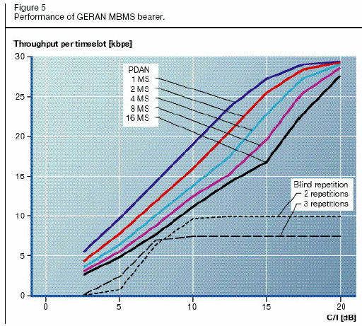 通過防真測(cè)試表明,在用戶集中的區(qū)域下進(jìn)行速度為40kbps的視頻廣播,在PDAN模式中需要二到四個(gè)時(shí)槽的EDGE信道來編碼,而盲目重傳模式則需要四個(gè)時(shí)槽的EDGE信道來編碼。 注意:一個(gè)規(guī)則的點(diǎn)對(duì)點(diǎn)EDGE信道能夠使用兩個(gè)時(shí)槽進(jìn)行相同速率的編碼,但是只有對(duì)一個(gè)使用者。對(duì)三個(gè)使用者,別需要六個(gè)時(shí)間點(diǎn)。四個(gè)使用者需要八個(gè)時(shí)間點(diǎn),等等。 因此,如果有兩個(gè)使用者在通電話,MBMS點(diǎn)對(duì)多點(diǎn)負(fù)載器就象一個(gè)規(guī)則的點(diǎn)對(duì)點(diǎn)連接一樣有效率。和隨著使用者的增加變得更加有效率。