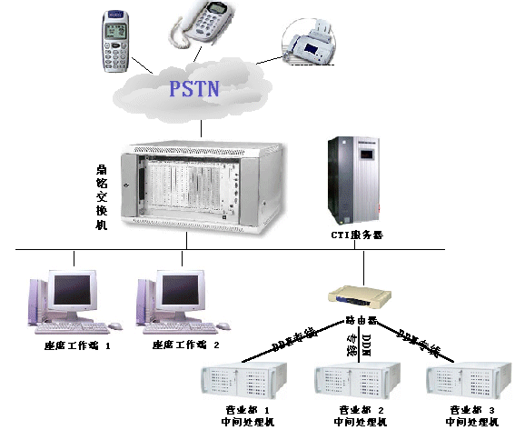 該系統(tǒng)總體來說就是,在一個地域中,相對集中的若干個營業(yè)部實行集中分布式統(tǒng)一管理,系統(tǒng)采用統(tǒng)一中繼號碼接入,支持現(xiàn)有的模擬線路、數(shù)字線路(中國一號信令、七號信令),實現(xiàn)統(tǒng)一座席管理,即所有座席功能集中在技術(shù)力量和業(yè)務(wù)力量較強的營業(yè)部或總部。