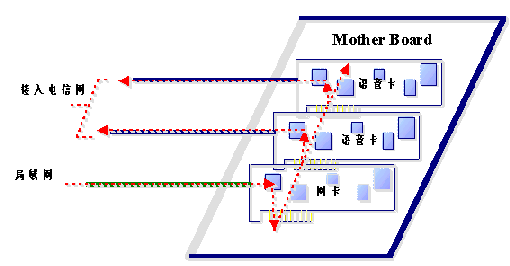 通過局域網(wǎng)傳遞語音數(shù)據(jù)本來就不能保證其時實時性,其結(jié)果就是用戶聽到的語音經(jīng)常斷續(xù),保證不了語音質(zhì)量。如果傳遞的語音數(shù)據(jù)是經(jīng)過壓縮的,語音數(shù)據(jù)本來就是通過TTS進行合成的,再經(jīng)過壓縮,則音質(zhì)會有很大的損傷,因此同樣保證不了語音質(zhì)量。從上圖中我們可以看到,經(jīng)TTS合成的語音數(shù)據(jù)從局域網(wǎng)經(jīng)過網(wǎng)卡,再通過主板PCI(或ISA)總線進入語音卡,最后進入電信網(wǎng),同樣語音數(shù)據(jù)通過計算機主板經(jīng)PCI(或ISA)總線進入語音卡也要求是實時的。這兩種實時性的要求會導致在接入量比較大的情況下,會給計算機的總線造成很大的負擔。因為總線的帶寬(數(shù)據(jù)吞吐量)是有限的。況且其它的板卡和接口(如聲卡、顯示卡等)也要直接或間接地占用總線。因此在接入量比較大的情況下,計算機的總線帶寬會成為一個比較關(guān)鍵的瓶頸。即便提高語音板卡的接入能力。在有大量電話接入的情況下,由于語音數(shù)據(jù)實時性的要求,也不能保證語音質(zhì)量。