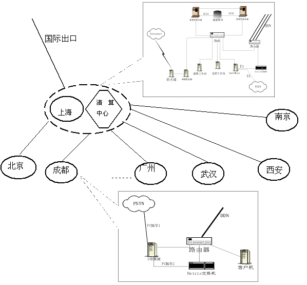 數(shù)據(jù)網(wǎng)絡為DDN專線構(gòu)成的Intranet,該Intranet在國內(nèi)可以有一個以上的國際出口。并通過防火墻同Internet連接。語音/數(shù)據(jù)的傳輸采用網(wǎng)絡交換設備。