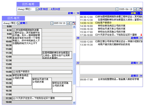 上圖"日歷管理"就借鑒了圖形化交互方法來(lái)安排日程和任務(wù)。這與您曾經(jīng)用過(guò)的桌面臺(tái)歷或記事本一樣,無(wú)需介紹就一目了然,并且要比在紙張上勾勾寫(xiě)寫(xiě)更方便、更有好處。例如,您此前計(jì)劃過(guò)日程,實(shí)際執(zhí)行有些變化,之后托托拽拽那個(gè)日程就可修改開(kāi)始時(shí)間、持續(xù)時(shí)間,或修改主題內(nèi)容,有效提高了記錄工作日程的效率;又例如,可以根據(jù)需要設(shè)定"提醒"--即便對(duì)過(guò)期的、未及時(shí)處理的工作安排隨后也會(huì)提示,有了這樣的人性化服務(wù)助手,員工自然歡喜。