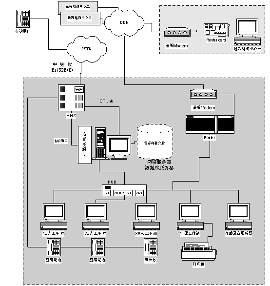 北京強訊恒通網(wǎng)絡(luò)技術(shù)公司通過利用該學院現(xiàn)有的計算機局域網(wǎng),根據(jù)該學院業(yè)務(wù)需求專門為800服務(wù)熱線設(shè)立了一組服務(wù)座席,每個座席都有座席電腦。所有撥打800熱線的電話通過CTI服務(wù)器的ACD系統(tǒng)分配到服務(wù)組最適合的座席。如該服務(wù)組暫時沒有空閑座席,則語音提示用戶等待并播放音樂,一旦有座席空閑則自動將該用戶電話轉(zhuǎn)接到空閑座席。當有外線進來接通到某個座席時,系統(tǒng)自動彈出該電話用戶的客戶資料。