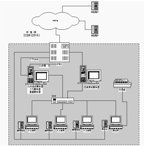 系統(tǒng)目前共設置了多個人工座席,每人工座席有電腦一臺,耳機式電話一部。人工座席的電腦與CTI,IVR語音服務器及數(shù)據(jù)庫服務器共處一個局域網(wǎng)內(nèi)。