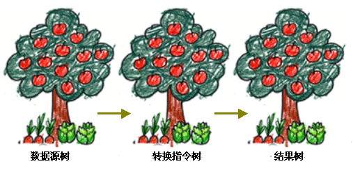 一棵或多棵數據源樹(XML數據源文件),通過一棵轉換指令樹(選擇數據、表達數據表現形式的模板文件),獲得了一棵結果樹(圖表、報表)。