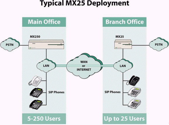 當與MX250一起使用時, MX25提供了一種既能將MX250的功能擴展至分支機構(gòu),同時又可確保該分支機構(gòu)與PSTN有效連接的低成本的解決方案。遠程機構(gòu)的工作人員同樣可以使用語音信箱、自動話務員、在線狀態(tài)和即時消息等功能。如同在總部工作一樣這些遠程機構(gòu)的工作人員可以與企業(yè)內(nèi)部任意其它地點的人員進行溝通,也可以擔當接線員或ACD(自動話務分配)組成員的工作。