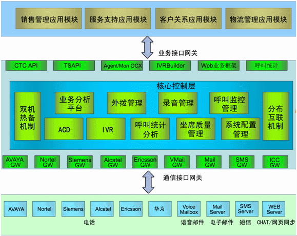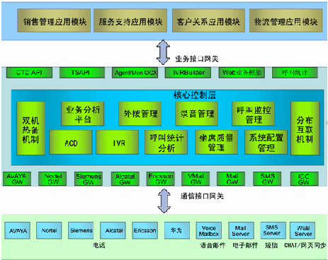 - 核心控制層:ACD、IVR、呼叫統(tǒng)計(jì)分析、坐席質(zhì)量管理、系統(tǒng)配置管理、業(yè)務(wù)分析平臺(tái)、預(yù)測(cè)外撥管理、工作流平臺(tái)、坐席資源管理、分布互連機(jī)制、雙機(jī)熱備機(jī)制;
