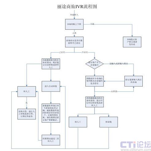 麗途商旅呼叫中心整個(gè)呼叫流程是:客戶通過全國400電話呼入系統(tǒng),IVR自動(dòng)應(yīng)答,根據(jù)客戶來電號(hào)碼通過URL的方式和業(yè)務(wù)系統(tǒng)數(shù)據(jù)庫進(jìn)行查詢?cè)搧黼娞?hào)碼是否是老客戶,然后直接播報(bào)客戶對(duì)應(yīng)的企業(yè)名稱和麗途的歡迎語,客戶可以進(jìn)行訂單的審批和密碼驗(yàn)證或者轉(zhuǎn)人工服務(wù);如果是來電號(hào)碼在數(shù)據(jù)庫中不存在,IVR系統(tǒng)提示客戶輸入企業(yè)編號(hào)或者轉(zhuǎn)接人工服務(wù),輸入企業(yè)編號(hào)還會(huì)在數(shù)據(jù)庫中查詢是否是已存在客戶并執(zhí)行相應(yīng)的流程,如是新客戶那么就會(huì)轉(zhuǎn)接人工服務(wù),由人工來進(jìn)行訂單的制定、審批,密碼驗(yàn)證等工作。