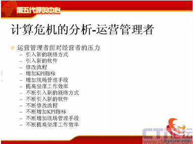 計算危機的下一方面是運營管理者,可能在座很多人是做運營管理的,你們會不斷去跟IT服務(wù)者提需求,我下一個月想引進新的聯(lián)絡(luò)方式,下個月我想引進新的軟件,引進新的流程,我想增加KPI指標,我想增加現(xiàn)場的管理手段,我想提高座席的工作效率,后面也是不斷的,不斷地去引入新的聯(lián)絡(luò)方式。
