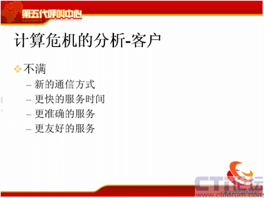 現(xiàn)在我們就分析一下后果,這時候計算危機的分析對于客戶來說,新的通訊方式我們都需要,可是呼叫中心沒有公布,我無法使用,更快的服務(wù)時間,大家看到了,比如說Web Chat,目前我點擊了80%是直接進入留言的頁面,也就是說這時候沒有人工來服務(wù)了,或者是等待時間非常非常長,一個小時以后告訴我,排隊已經(jīng)到了,已經(jīng)沒有人能為我服務(wù)的,服務(wù)時間是根本沒有辦法保證的。第三個方面我們要更準確的服務(wù),電話打進去以后告訴我的信息和網(wǎng)絡(luò)告訴我的信息是完全不一樣的呢?為什么呢?因為它的知識庫沒有關(guān)聯(lián)起來,業(yè)務(wù)流程沒有關(guān)聯(lián)起來,這種更友好的服務(wù),考核的指標都是一樣的。