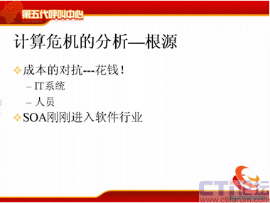 我們分析這個根源,根源其實就是錢的問題,昨天我聽了遠傳的Bill的講座,講得非常精彩,而且非常幽默,他在整個講的過程中,不斷地提一個次,提了30多次,說是“很花錢”呀,“太花錢”了,“很花錢”。確實是很花錢,呼叫中心是一個燒錢的中心,這是他的理論,其實我的想法也是一樣的。那么對于IT系統(tǒng)來說,確實需要花很多錢,現(xiàn)在的系統(tǒng)大家想想系統(tǒng)要么和CRM對接,要么和ERP對接,有的和供應(yīng)鏈對接,有的和人力資源管理對接,有的和業(yè)務(wù)核心系統(tǒng)對接。那么人員上也是很花錢的,對于外包呼叫中心來說,客戶服務(wù)200座席左右的,人工的成本占到了75%,這個成本是非常高的,確實是很花錢。那么剛才也說了,剛才那些需求,短信的需求,大家看雖然很復(fù)雜,如果給我一千萬的話,我能輕松地把它搞定,給我一年的時間,但這是不現(xiàn)實的。解決的辦法有嗎?有,SOA。SOA是現(xiàn)在軟件行業(yè)一直在做的一件事情,是公認的標準,但是它剛剛進入中國,而且還都沒有進入呼叫中心。