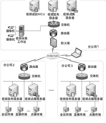 旺城國際控股集團(tuán)視頻會議系統(tǒng),其Internet出口帶寬為10M,因為該出口還要傳輸各種業(yè)務(wù)數(shù)據(jù),所以實際用于視頻會議的帶寬大概在5M左右,各分公司的接入速率在384Kbps~768Kbps之間。方案采用一臺高性能服務(wù)器作為MCU,以確保支持五會場的遠(yuǎn)程接入。同時,在五個分公司配置一臺直播服務(wù)器,支持各地Intranet(均為100M帶寬)內(nèi)的電腦用戶接收會議現(xiàn)場組播,并錄制、上傳到點(diǎn)播服務(wù)器備份以供會后研討。整個視頻會議的包括:
