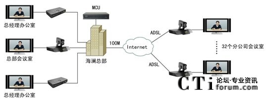 2009年6月,領先的視訊廠商科達攜TrueSens(致勝)視頻會議系統(tǒng)走進海瀾,為海瀾集團搭建了一套覆蓋總部2個領導辦公室、1個銷售會議室及全國32個分公司的視頻會議系統(tǒng)。整個方案在部署上非常便捷,海瀾江陰總部的機房架設一臺高、標清一體化多點控制單元(MCU),銷售會議室、集團王總、陶總的辦公室以及海瀾集團在全國的32個分公司銷售會議室則各部署一套視頻會議終端?偛繋挒100M,分支機構則均通過普通ADSL接入。系統(tǒng)拓撲圖如下: