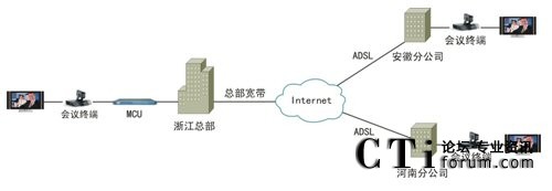 該套視頻會議系統(tǒng)最大的特點就是擁有超強的網(wǎng)絡(luò)適應(yīng)性。由于采用了高效視音頻編碼技術(shù)和大量智能化網(wǎng)絡(luò)適應(yīng)技術(shù),無論是ADSL、光纖還是VPN,均可進行快速接入,并充分保證在Internet環(huán)境下的會議效果。因此,天元置業(yè)此次視頻會議系統(tǒng)就是完全基于公司現(xiàn)有的Internet進行部署的。如圖1。