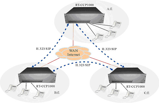 - 多個位于不同地點的RT-CCP1000通過廣域IP網(wǎng)互連,組成一個統(tǒng)一系統(tǒng),實現(xiàn)遠(yuǎn)程無縫通信。