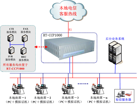 系統(tǒng)架構(gòu)簡單,CIT服務(wù)模塊、傳真服務(wù)模塊、IVR服務(wù)模塊、錄音服務(wù)模塊都內(nèi)置在RT-CCP1000內(nèi),從電信運(yùn)營商接入1條數(shù)字中繼E1到RT-CCP1000,RT-CC1000提供20個(gè)人工座席10路VIR,同時(shí)支持語音、留言、傳真、短信、郵件方式,為申銀萬國客戶提供全方位的服務(wù)模式;提供業(yè)務(wù)系統(tǒng)接口與申銀萬國后臺業(yè)務(wù)系統(tǒng)無縫整合,實(shí)現(xiàn)呼叫中心系統(tǒng)與業(yè)務(wù)系統(tǒng)的緊密結(jié)合;為申銀萬國量身定制多款個(gè)性化的工單。維護(hù)界面采用全中文WEB方式,支持遠(yuǎn)程維護(hù),同時(shí)也支持遠(yuǎn)程座席方式,為后續(xù)公司的發(fā)展打下了堅(jiān)實(shí)的基礎(chǔ)。
