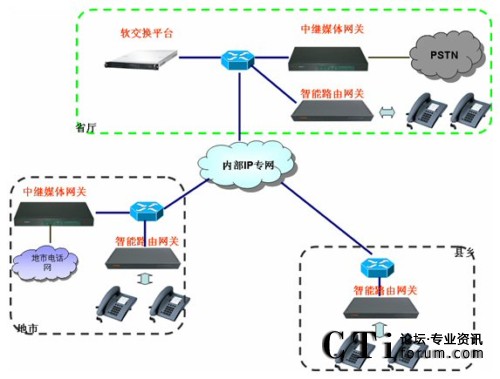 通過上述三環(huán)節(jié),即在財政內(nèi)部網(wǎng)上建立了一套跨區(qū)域的電話系統(tǒng)。拓撲示意圖如下: