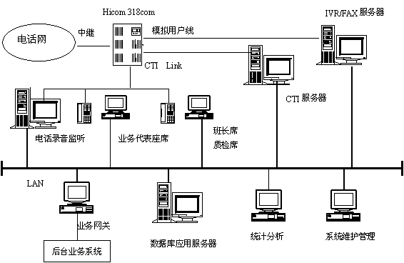 主要包括:Siemens Hicom 318com交換機(jī)、CTI服務(wù)器、IVR/FAX服務(wù)器、業(yè)務(wù)代表座席、班長和質(zhì)檢座席、電話錄音監(jiān)聽系統(tǒng)、數(shù)據(jù)庫應(yīng)用服務(wù)器、統(tǒng)計分析工作站、系統(tǒng)維護(hù)管理工作站、業(yè)務(wù)網(wǎng)關(guān)、網(wǎng)絡(luò)系統(tǒng),其邏輯結(jié)構(gòu)下圖所示。