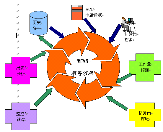 如上面所描述的WFMS流程,最初開始于歷史的電話信息、目前的ACD數(shù)據(jù)和服務(wù)代表的簡介。從這些綜合的信息,做出對(duì)工作量的預(yù)測,從而從本質(zhì)上決定了配備給呼叫中心的服務(wù)代表數(shù)量。了解了服務(wù)代表的需求數(shù)量,一個(gè)適用于任何時(shí)間段的工作時(shí)間表就可以產(chǎn)生了,包括每天的,每周的,每月的;谶@一點(diǎn),主管人就可以監(jiān)控服務(wù)代表的行為,追蹤來電,并分析不同種類的來電分組,做出應(yīng)對(duì)假定情景的方案,從而產(chǎn)生各種各樣的報(bào)告和圖表。