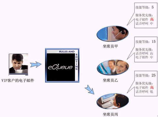 我們假設(shè)在某個(gè)聯(lián)絡(luò)中心里,有甲、乙、丙三位坐席員工作在同一個(gè)項(xiàng)目組(坐席組)。甲是新員工,只具有基本服務(wù)技能,經(jīng)驗(yàn)很有限;乙是一位擁有豐富經(jīng)驗(yàn)的坐席員,語音呼叫應(yīng)答技巧非常嫻熟,具有回復(fù)電子郵件的技能但是熟練程度略低于語音應(yīng)答技能;丙是一位經(jīng)驗(yàn)豐富、技能全面的坐席員,業(yè)務(wù)熟練,其最擅長(zhǎng)的是回復(fù)客戶的電子郵件。假設(shè)有一位重要客戶發(fā)來電子郵件咨詢一個(gè)非常專業(yè)的技術(shù)問題。由于這是一位VIP客戶,服務(wù)條款中規(guī)定了他所有的呼叫請(qǐng)求都必須由經(jīng)驗(yàn)豐富的坐席員來響應(yīng)。在eQueue多媒體單一隊(duì)列中,他的電子郵件被限定為坐席員的技能只有達(dá)到或超過等級(jí)15才有資格回復(fù)。在3個(gè)坐席員中,甲因?yàn)榧寄艿燃?jí)只有5,不能滿足回復(fù)郵件的先決條件,雖然擁有此項(xiàng)技能且優(yōu)先級(jí)為高,依然沒有資格響應(yīng)這個(gè)聯(lián)絡(luò)請(qǐng)求;乙、丙的技能等級(jí)都滿足回復(fù)郵件的條件,但是丙的此項(xiàng)技能服務(wù)優(yōu)先級(jí)為高,因此,在丙坐席員處在可服務(wù)狀態(tài)下,eQueue會(huì)將此VIP客戶的電子郵件優(yōu)先派發(fā)給她。只有當(dāng)她處于忙碌狀態(tài)時(shí),才會(huì)派發(fā)給乙坐席員。