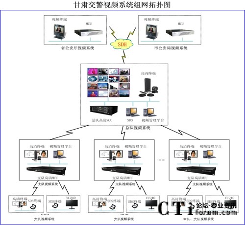 本次建設(shè)的交警總隊(duì)視頻會(huì)議系統(tǒng),包含覆蓋全省交警總隊(duì)、多個(gè)支隊(duì)、大隊(duì)、中隊(duì)的大型視頻會(huì)議網(wǎng)絡(luò)。其中包含了2個(gè)總隊(duì)會(huì)場16個(gè)支隊(duì)、100個(gè)大隊(duì)與16個(gè)中隊(duì)。交警總隊(duì)、支隊(duì)、大(中)隊(duì)與省公安廳、市州公安局通過SDH專線進(jìn)行交互訪問,支隊(duì)與市州公安局、大隊(duì)與區(qū)縣公安局、總隊(duì)到各支隊(duì)的網(wǎng)絡(luò)均為專線聯(lián)接。